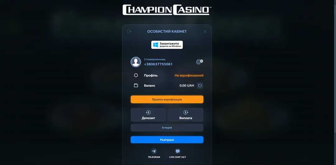 Особистий кабінет Сhampion Casino надає гравцям доступ до всіх необхідних функцій для комфортної та безпечної гри.